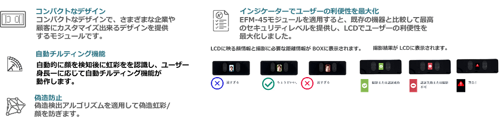 EFM-70は虹彩や顔登録、認証モジュールタイプ製品で、KIOSKやATMなど組み込みシステムと連携対応する商品です。 CMITechテクノロジーのSelfie機能を採用し、小型で使いやすいインターフェースを備えています。 1.45インチカラーLCDは直感的なユーザーインターフェースを提供し、画面と音声ガイド情報を介して利便性を高めます。