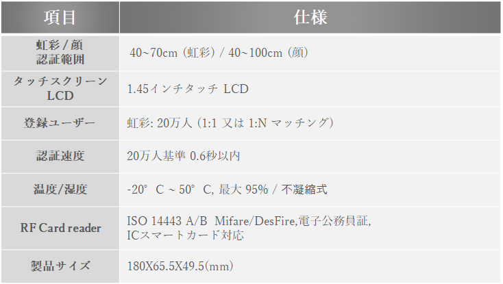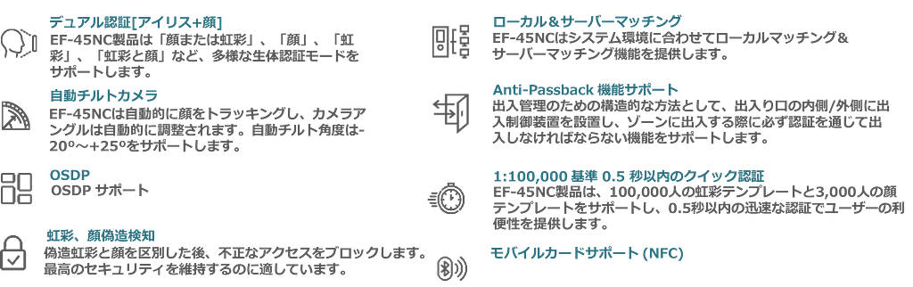 EF-45NC虹彩/顔認証をサポートする製品です。シングルモデルで世界で最も売れた商品です。二重認証ソリューション製品で、30-45CMの距離で虹彩/顔を素早く二重認証し、直感的なユーザーインターフェースでユーザーが簡単かつ便利に使用できます。 100,000人のユーザーを保存でき、1:Nモードで100,000人のユーザー基準で0.5秒の認証速度を誇ります。