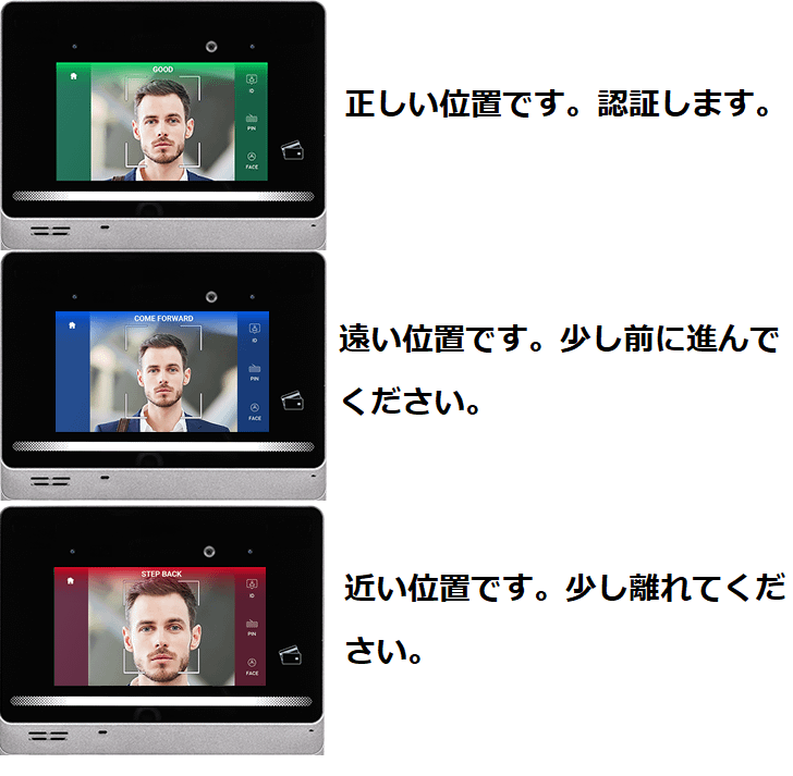 左記画像に様に、画面の色で虹彩認証に位置決めが容易になりました。